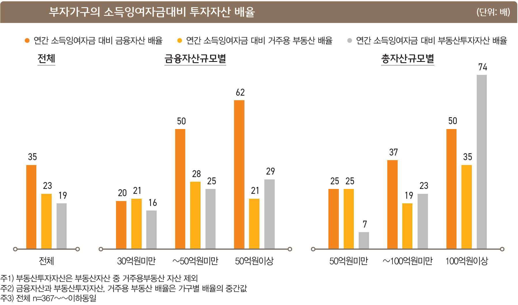 ‘연간 소득잉여자금 대비 금융자산 배율’(35배)이 ‘거주용 부동산자산 배율’(23배)과 ‘부동산투자자산 배율’(19배)에 비해 높았다. 그러나 상당수 부자들이 거주용 주택을 이용해 종잣돈을 모았다는 점을 고려하면 실질적으로 부동산투자(42배)가 금융투자(35배) 에 비해 더 높게 배분된다고 볼 수 있다.