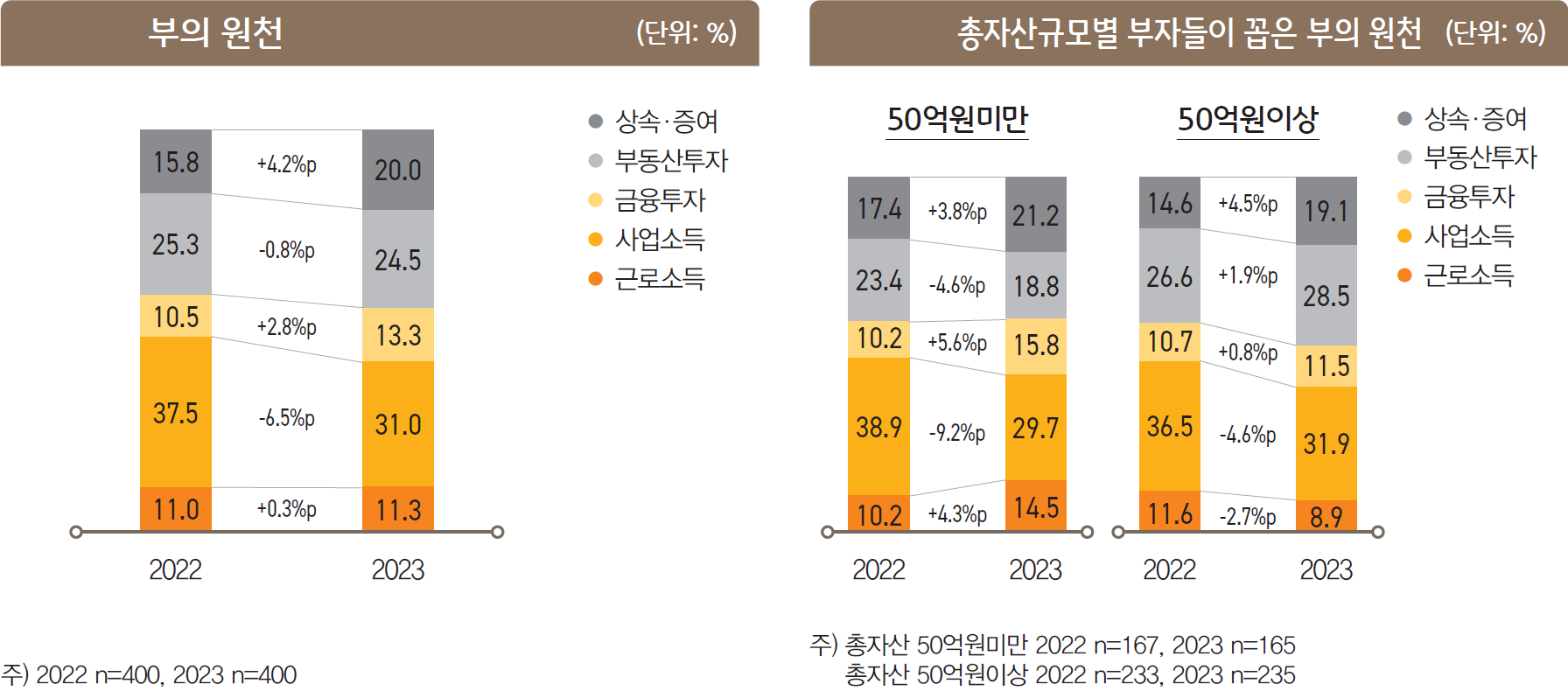 22년에 비해 23년은 부동산의 부의 기여도가 줄고 금융투자와 상속.증여는 증가하고 있다.