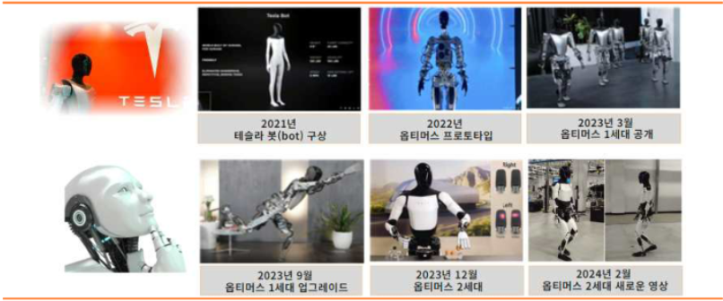 - 지난해 12월 말 1세대에 비해 더욱 날렵해지고 향상된 기능을 갖춘 휴머노이드 로봇 '옵티머스 2세대' (Optimus Gen 2)의 새로운 영상 공개(2.24)했으며 필드테스트 단계에 진입