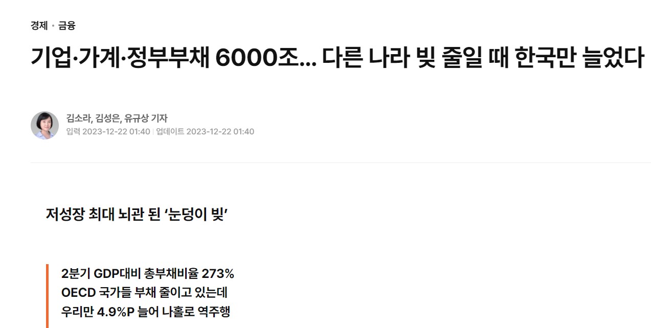 국제금융협회에서 조사한 바에 따르면 23년 3분기 기준 세계 주요국 기준 3위이다. 화폐를 계속 찍어내도 문제가 없는 기축통화 국가보다도 높다. 또한, 기업 45%가 번 돈으로 이자도 못 내고 있다.