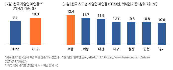 2023년 자영업(외식업) 폐업률도 10%로 2022년 8.8% 보다 폐업률이 약 14% 증가했다. 우리나라는 자영업이 차지하는 비중이 높기 때문에 자영업의 사정이 녹록지 않다는 것은 경제가 좋지 않다는 것을 의미한다. 특히 내수의 50% 이상 책임지는 서울 포함 수도권의 폐업률이 높다.