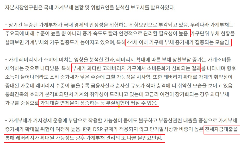 가계부채의 위험에 대해서는 자본시장연구원 보고서에 상세하게 나와 있다.