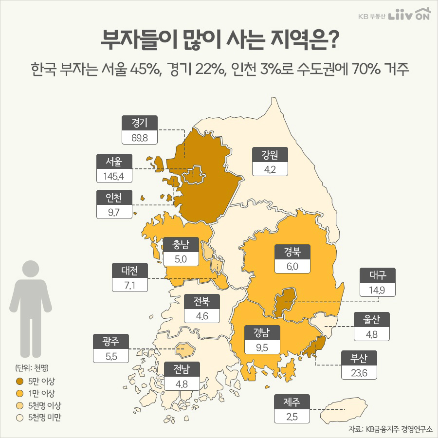 부자들이 사는 곳은 서울 등 수도권 거주 비중이 70.6%로 가장 높았다. ‘부(富)의 집중도 지수’를 산출해 부 집중도가 1.0을 넘으면 부촌으로 분류하는데, 부촌 목록에 서울 강남·서초·종로·용산구에 이어 성수동을 포함한 성동구가 새롭게 등장했다.