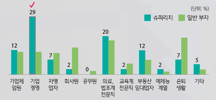 부자들의 직업은 일반인들이 생각하는 것처럼 기업 경영자가 제일 많고 그 다음은 전문직 종사자이다. 특히 슈퍼리치에서 한정적으로 보면 이 두 직업이 과반을 차지한다. 일반 회사원의 경우, 부자까지는 가능하나 슈퍼리치가 되기 위해서는 사장과 같은 고위직으로 올라갔을 때 가능하다.