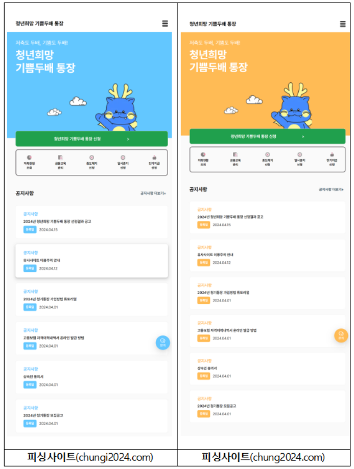 금감원에 따르면 '청년희망기쁨두배통장'을 위장한 해당 웹사이트 주소는 'chungi2.com, chungi2024.com, chung2024.com'로, 차단되자 유사한 주소로 사이트 개설을 반복