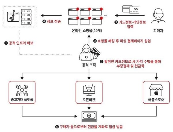 범죄 조직은 국내 중·소규모의 온라인 쇼핑몰을 해킹해 정상 결제과정에 이용자 정보를 탈취하는 피싱페이지 삽입했다. 이를 통해 쇼핑몰 이용자들이 입력한 신용카드 정보·개인정보 등 14가지 민감정보를 조직 서버로 전송했다.