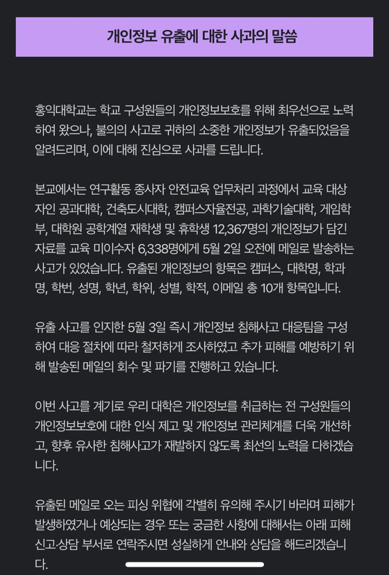 - 지난 2일 홍익대학교에서 학생들의 개인정보가 이메일로 유출