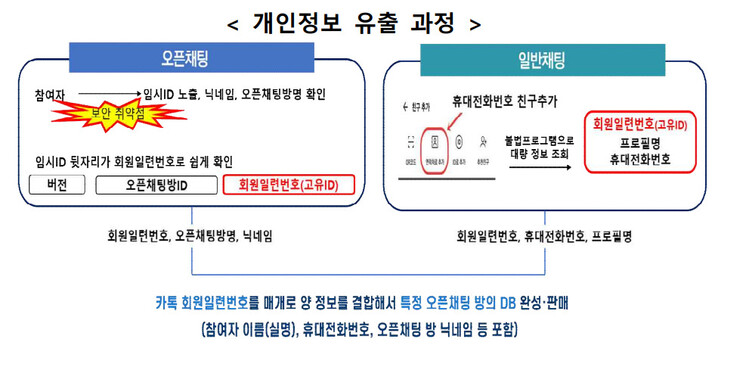 - 업체가 카카오톡 오픈채팅방 이용자들의 아이디 정보를 추출한 뒤 다른 개인정보와 결합하는 방식으로 이름, 휴대전화번호 등 개인정보를 수집해 시중에 판매