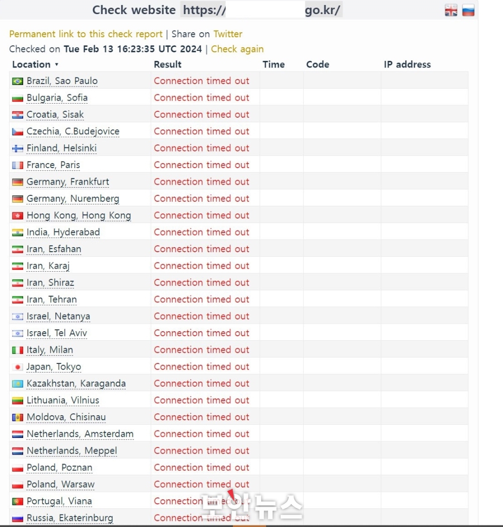 체크 웹사이트를 통해 확인한 기획재정부 영문 사이트 에러 화면[이미지=보안뉴스]