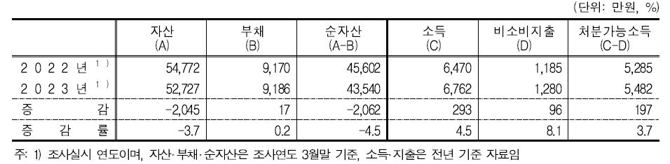 다음은, 가구소득 평균 보유 자산을(부채 포함) 보면 전체 소득 구간에서 2023년에 전년 대비 감소했다. 하위 2 분위의 자산 감소 폭이 가장 크다. 상위 20%의 자산 대한민국에서 차지하는 자산 비율이 44.5%로 전년 대비 0.4% 증가했다. 하위 20% 자산은 0.3% 증가했다. 중산층은 옅어지고 고소득 및 저소득자가 증가하고 있다. 즉, 갈수록 빈부 격차는 심해지고 있다.