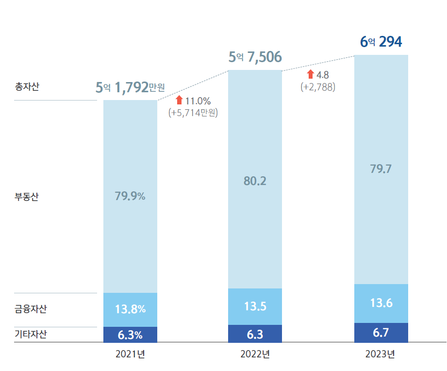 2023년 기준으로 가구 내 평균 보유 자산이 6억을 돌파했다(신한은행 자료 기준). 통계청 기준으로는 5억 2천 정도이다. 그런데 이 지표는 순자산 아니다. 부채를 빼면, 순자산은 4억 3천 정도이다.