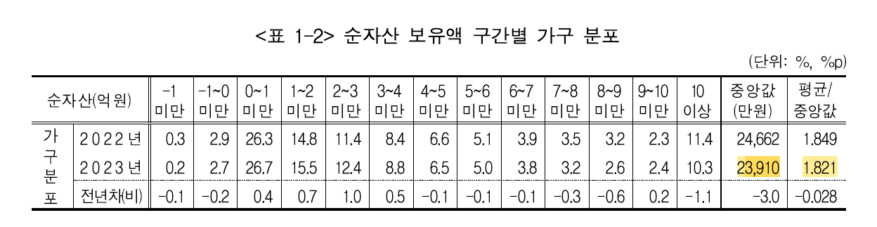 결론, 가구당 순자산 2억 4천이고(중앙값) 2023년은 전년대비 자산이 감소했으면 빈부 격차도 약간 증가했다.