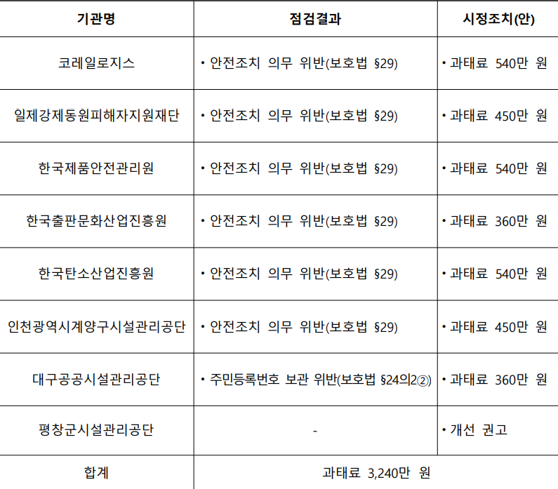- 코레일로지스 - 암호화 조치는 했으나, 복호화될 수 있는 위험성이 있는 것으로 조사됐으며, 암호화 기술 수준 등이 미흡