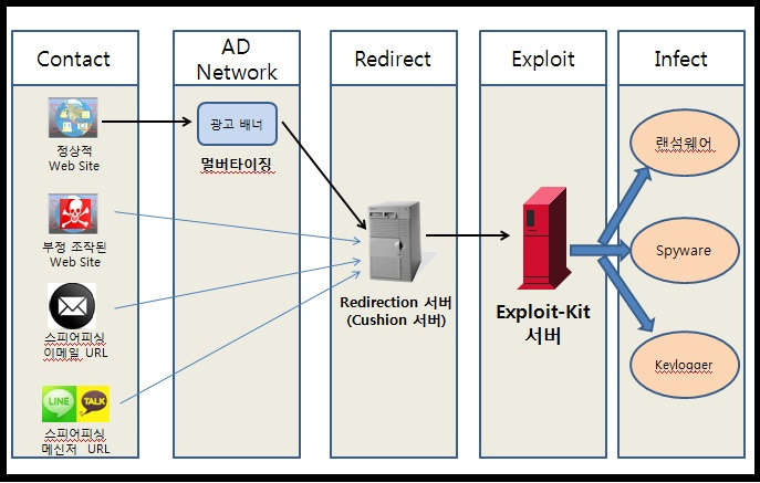 - 광고 로드 시 감염 : 합법적인 웹사이트를 방문하면 광고가 악성인지 알 방법이 없다. 하지만 악성 광고가 로드되는 즉시 해당 광고에 포함된 맬웨어가 다양한 방식으로 활성화될 수 있다.