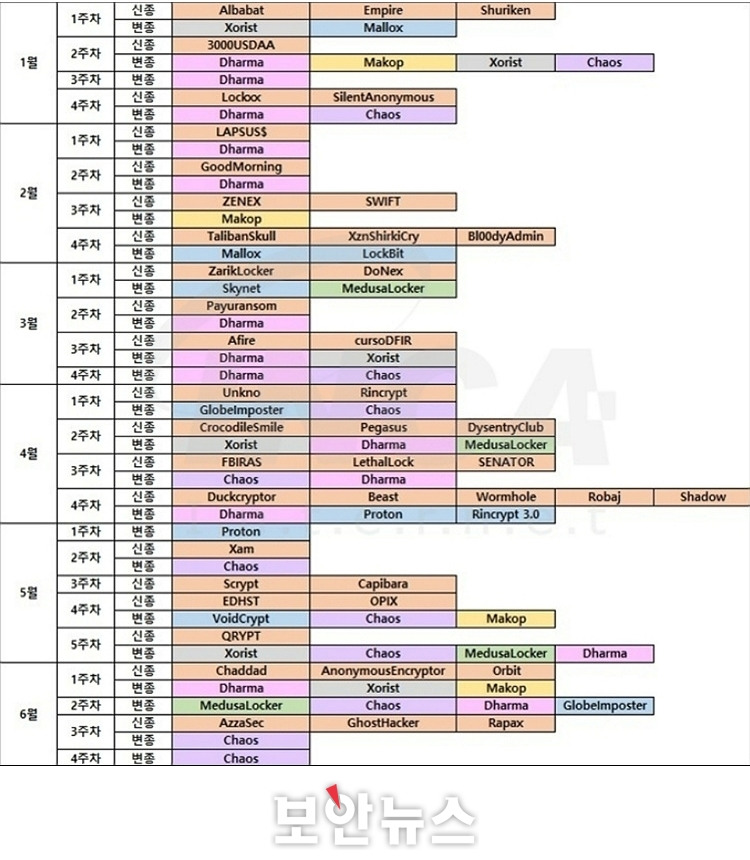 - 이 가운데 신종 랜섬웨어는 4월에, 변종 랜섬웨어는 1월에 가장 많이 발견
