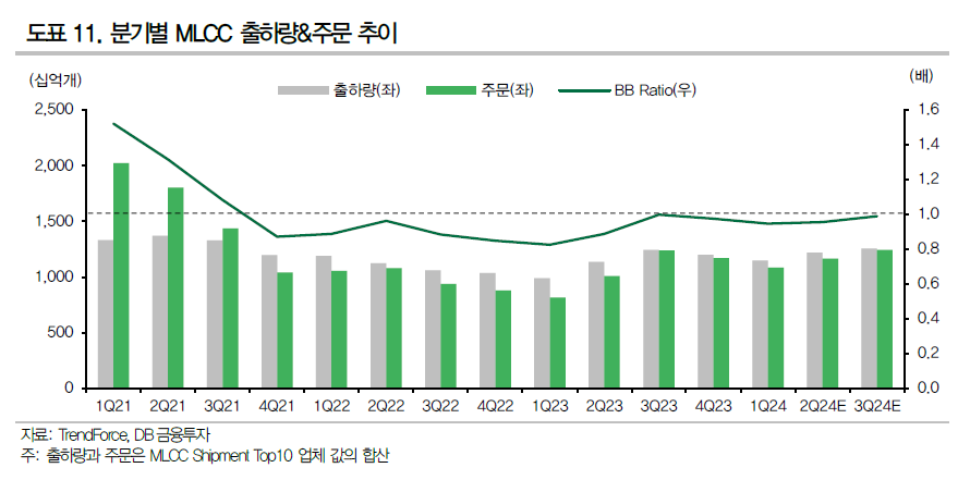 - AI 서버 및 전장용 수요 확대, IT 성수기 효과 등으로 인해 MLCC 출하량 증가, 가동률 상승, ASP 상승 등이 예상