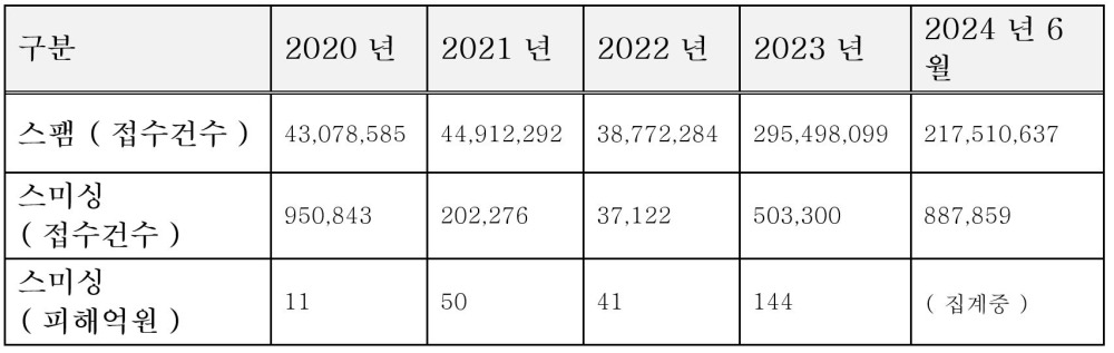 국회 과학기술정보방송통신위원회 최수진(국민의힘) 의원이 한국인터넷진흥원(KISA)으로부터 받은 자료에 따르면 2024년 1월~6월 휴대전화 불법 스팸 신고는 총 2억 1,751만 637건으로 집계됐다. 이 중 스미싱 피해 신고는 88만 7,859건으로 지난 2020년(95만 843건) 이후 가장 많았다.