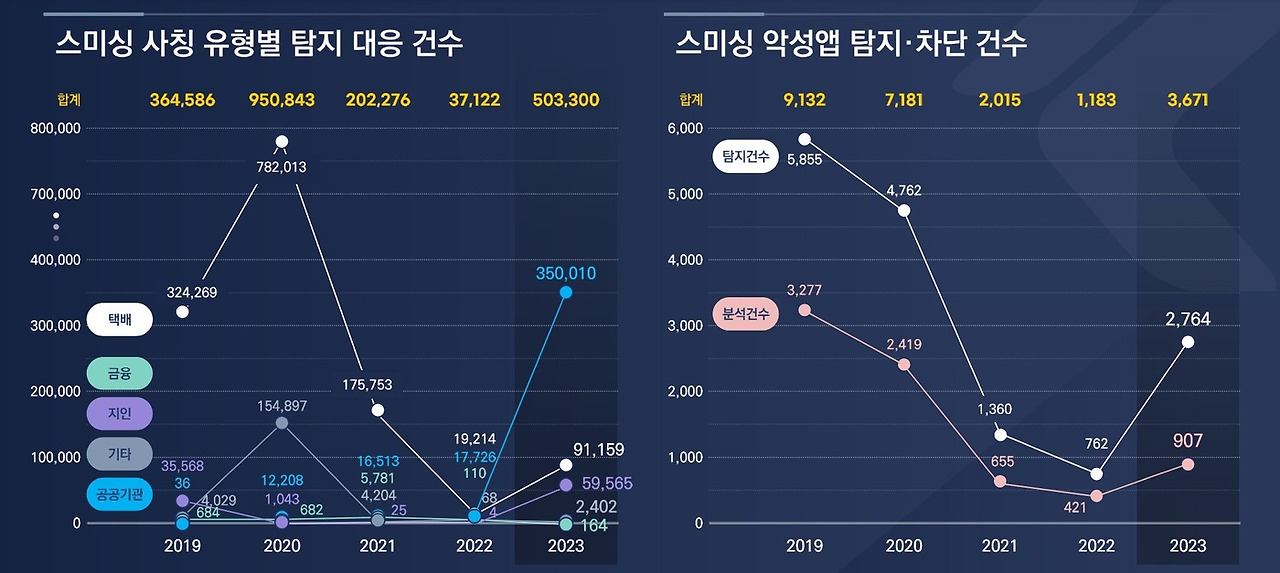 한국인터넷진흥원(KISA)에 따르면 2024년 기준 스미싱 탐지 건수는 150만 건으로, 전년 대비 약 3배가량 증가