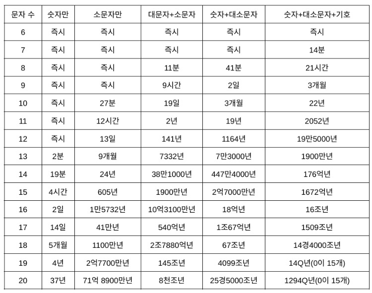 비밀번호 길이와 복잡도에 따른 크랙 (유출) 가능 시간