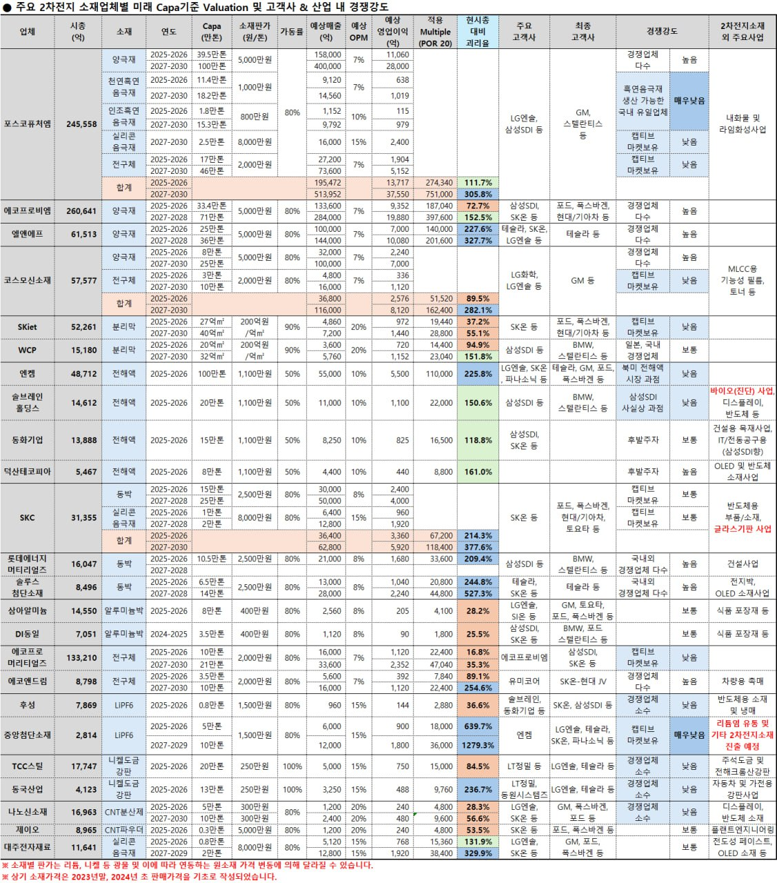 주요 2차전지 소재업체별 Valuation 및 선호주식