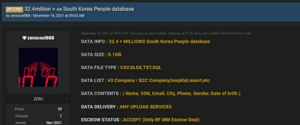 다크웹에 올라온 국내 개인정보 데이터베이스(출처, SK쉴더스)