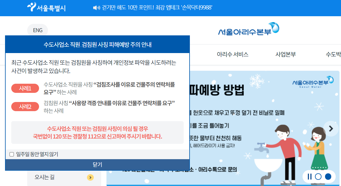 • 서울아리수 수도사업소 직원·검침원  사칭하여 건물주의 연락처 요구