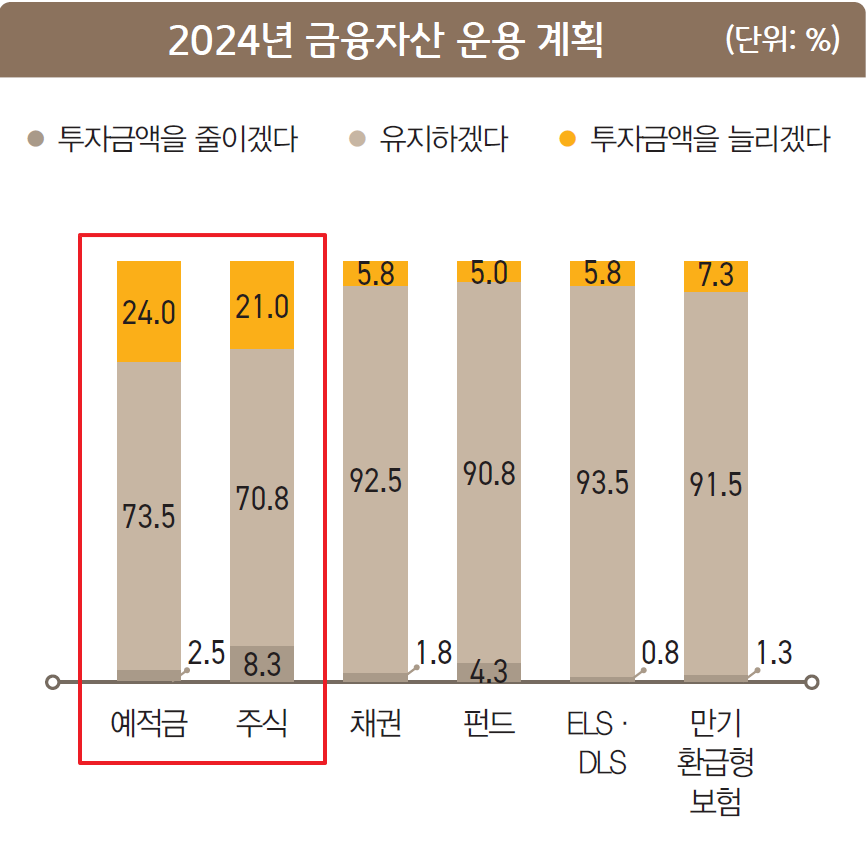 24년에 고수익이 예상되는 투자처로 ‘주식’(47.8%)과 ‘거주용 주택’(46.5%)을 최우선으로 꼽았으며, 다음으로 ‘금ㆍ보석’(31.8%)과 ‘거주용 외 주택’(31.0%)도 매우 유망하다고 생각하고 있다.