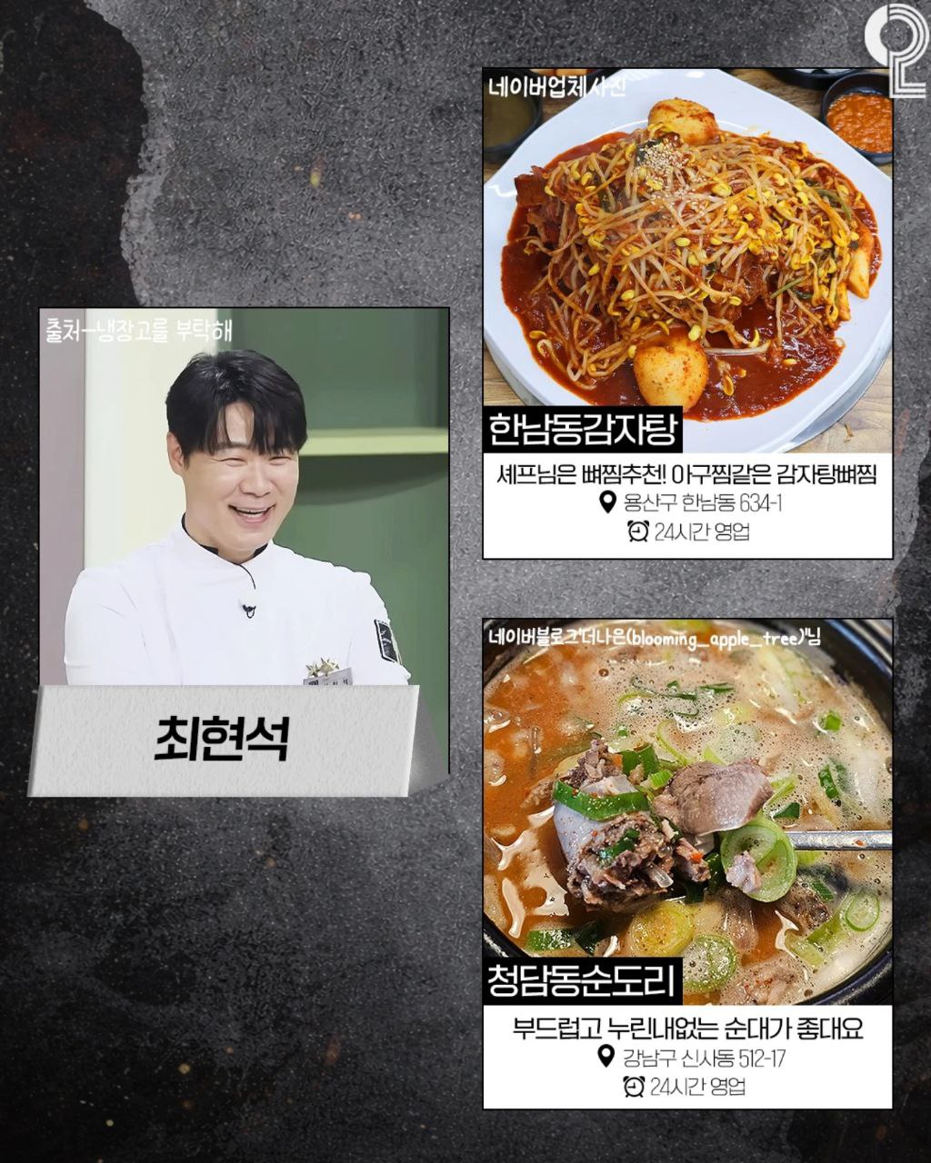 | 최현석 | 한남동감자탕 | 서울 용산구 한남동 634-1 | 한식 (감자탕/뼈찜) |