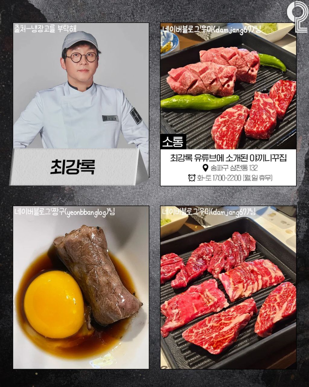 | 최강록 | 소통 | 서울 송파구 삼전동 132 | 일식 (야끼니꾸) |