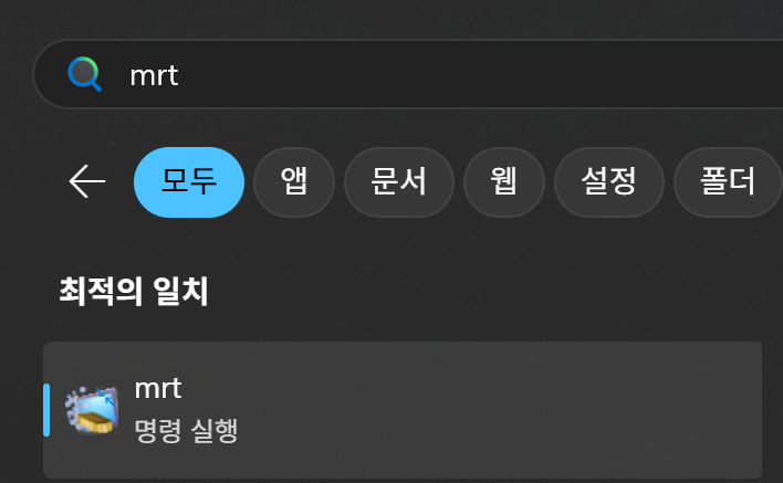 - 검색창에 MRT를 입력하고 실행하면 마이크로소프트에서 제공하는 '악성 소프트웨어 제거 도구'가 활성화