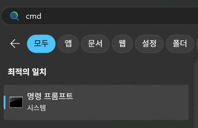 - 검색창에 CMD(명령 프롬프트)를 입력한 후 '관리자 권한으로 실행'