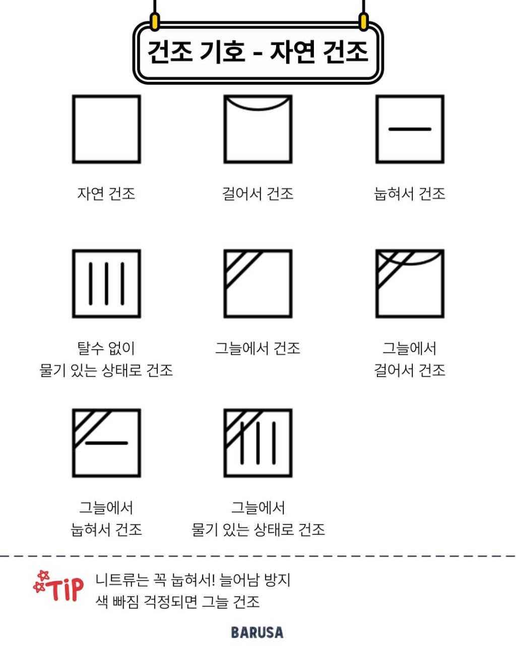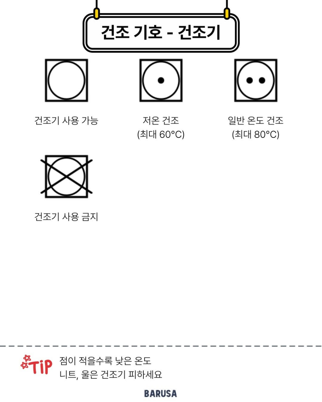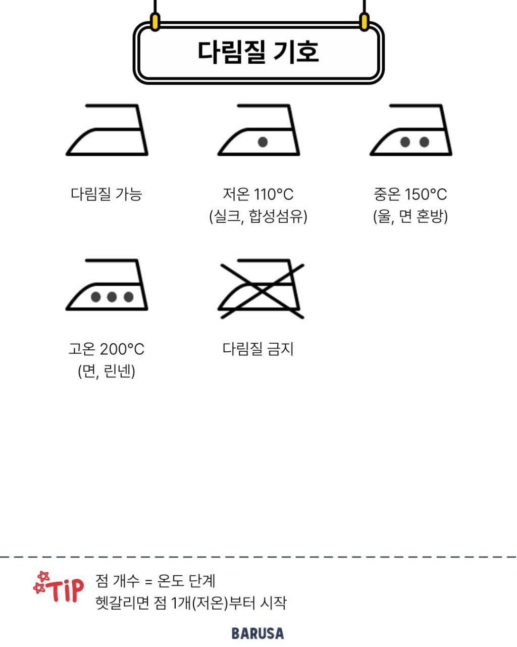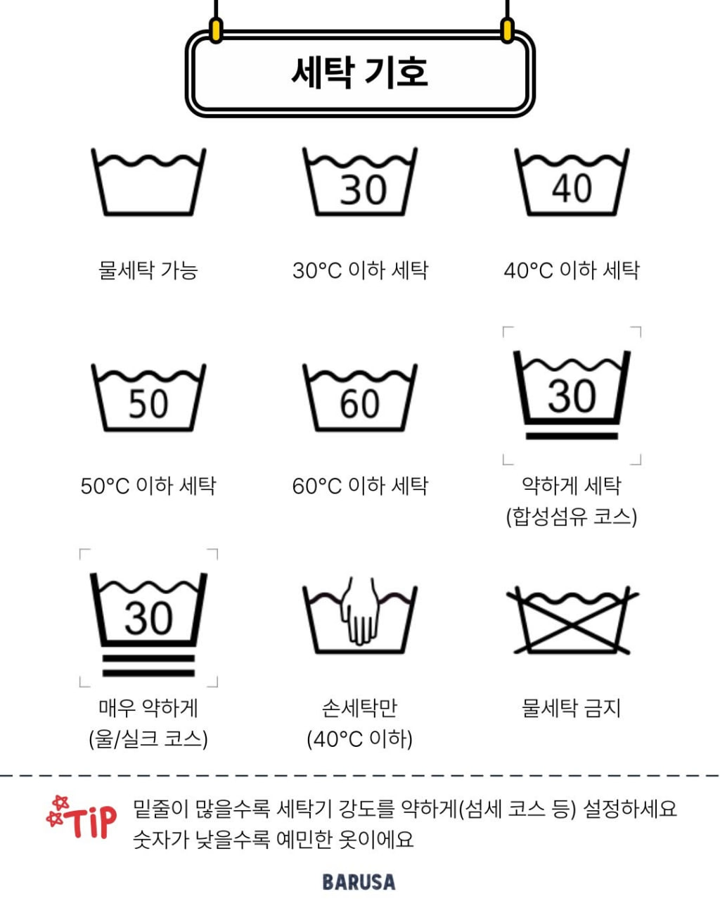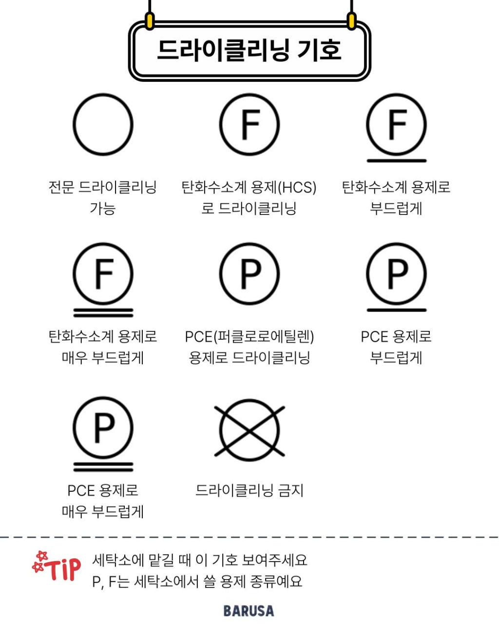 세탁, 드라이크리닝, 다림질, 건조 , 표백 기호 설명