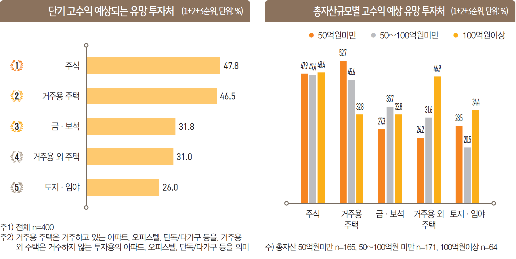 24년에 고수익이 예상되는 투자처로 ‘주식’(47.8%)과 ‘거주용 주택’(46.5%)을 최우선으로 꼽았으며, 다음으로 ‘금ㆍ보석’(31.8%)과 ‘거주용 외 주택’(31.0%)도 매우 유망하다고 생각하고 있다.