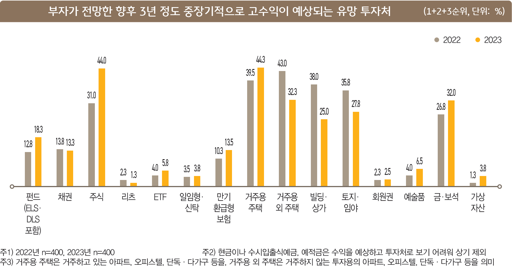 종합해 보면 올해 및 향후 3년 이내로 유망 투자처로 똘똘한 거주 목적 주택과 주식 시장을 좋게 보고 있다.