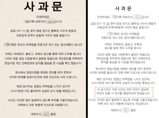 • 대표이사 명의 사과문을 내 "금일 문자 발송을 받으신 불특정 다수의 분들과 의료업계 관계자 분들께 사회의 말씀을 올린다"며 "영업 사원분께서 잘못된 방법으로 개인정보를 취득해 영업사원 개인 전화번호로 문자를 발송을 했다"고 밝힘