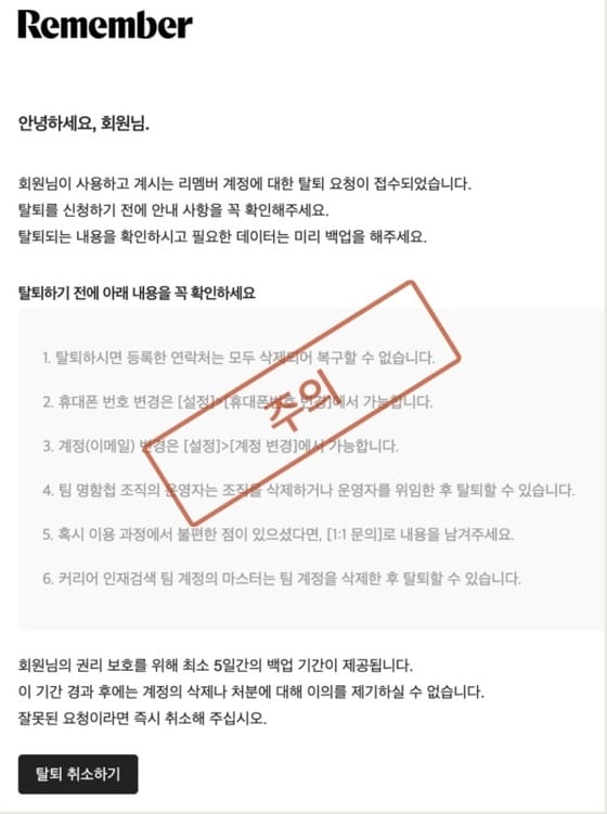 피싱 메일은 "리멤버 계정에 대한 탈퇴 요청이 접수되었습니다"라는 제목으로 발송됐다.