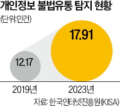 한국인터넷진흥원(KISA)에 따르면 지난해(2023년) 개인정보 불법 유통 탐지 건수는 17만9138건으로 2022년 16만1743건 대비 10.7% 증가한 것으로 집계됐다. 2019년 12만1714건과 비교하면 47.1% 늘었다.