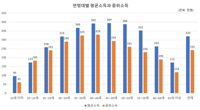 가구 소득이 아닌 개인별 평균소득과 중위소득을 보면 경제활동의 정점기인 40대에 평균소득 300만원 후반 대이다. 그러나 평균소득은 초고소득자의 수입이 평균을 끌어 올리는 오류가 있어 중위소득을 보면 300만원 초반대이다. 실질 임금과 비슷하거나 약간 낮은 수준이다.