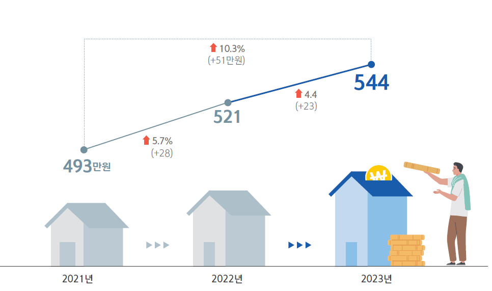 결론, 대한민국 평균 월소득은 세후기준 544만원이고 근로 및 사업 소득보다 사업 외 소득이 최근 2년 동안 더 많이 증가했고 고소득과 저소득 간의 차이는 더욱 벌어졌다.