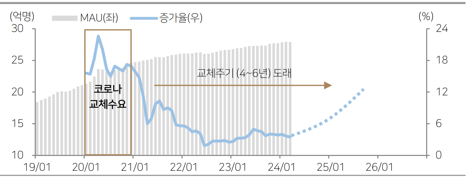 교체주기 도래 : 통상적으로 클라우드 서버의 교체주기는 약 4~6년. 코로나19 영향으로 빠르게 증설됐던 20~21년 서버들의 교체주기가 24년부터 도래