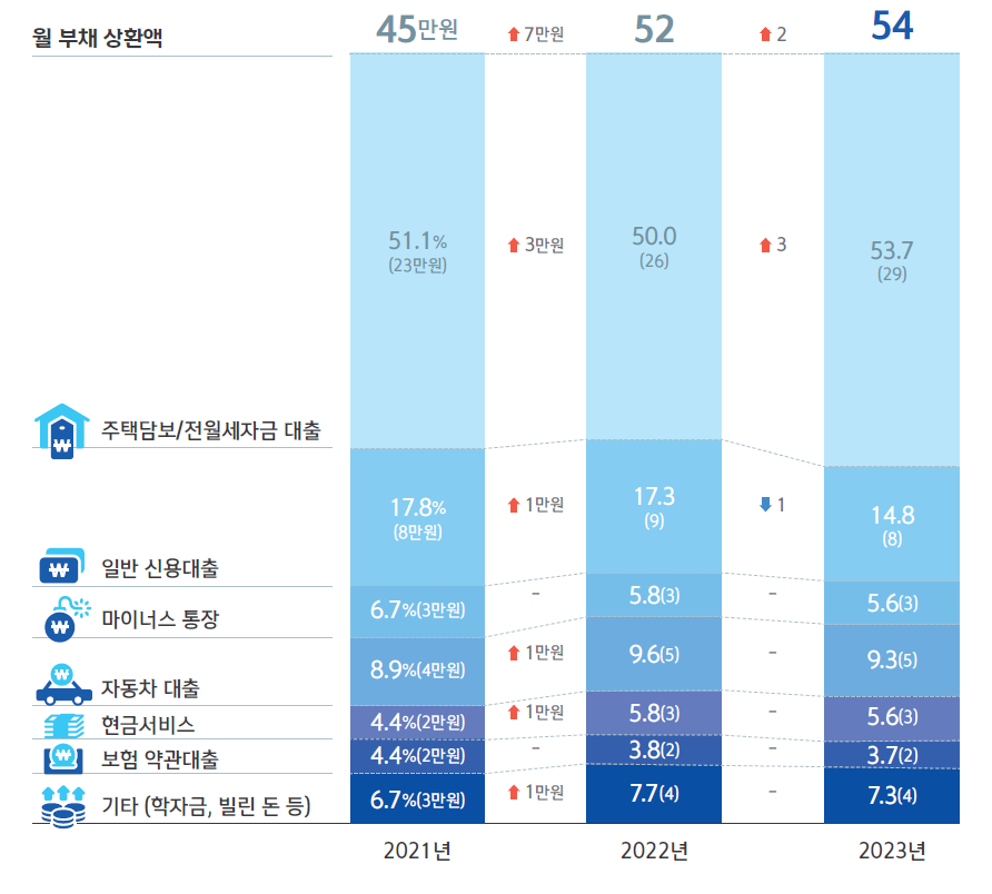 모든 대출상품별 월평균 부채 상환액이 2021년 수준을 유지하거나 증가한 반면 2023년에는 주택담보/전월세자금대출만 늘었다.