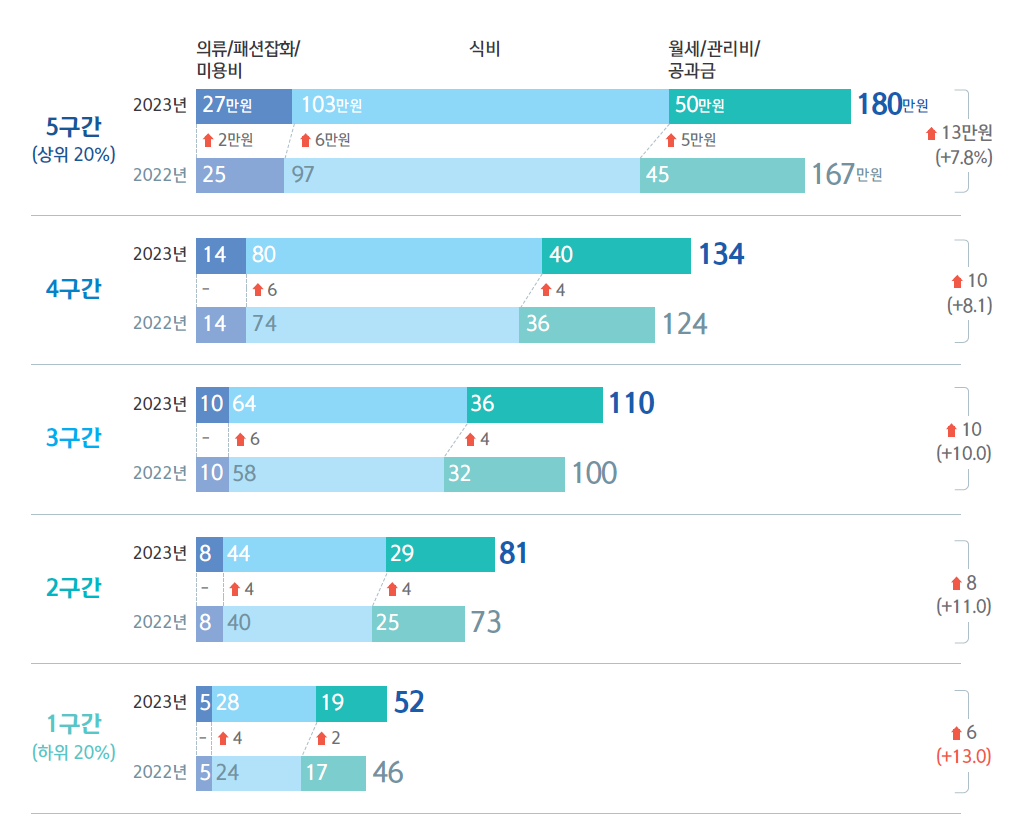 의식주 중 가장 큰 소비를 차지하는 항목은 식비로, 1~2구간은 4만 원, 3~5구간은 6만 원 더 늘었는데, 식재료, 외식비 등 먹거리 물가가 치솟은 영향으로 보인다. 주거비 또한 모든 소득구간에서 2~5만 원 늘었는데, 전세사기 불안으로 인한 월세 수요 증가, 공공요금 인상에 따른 것으로 보인다.