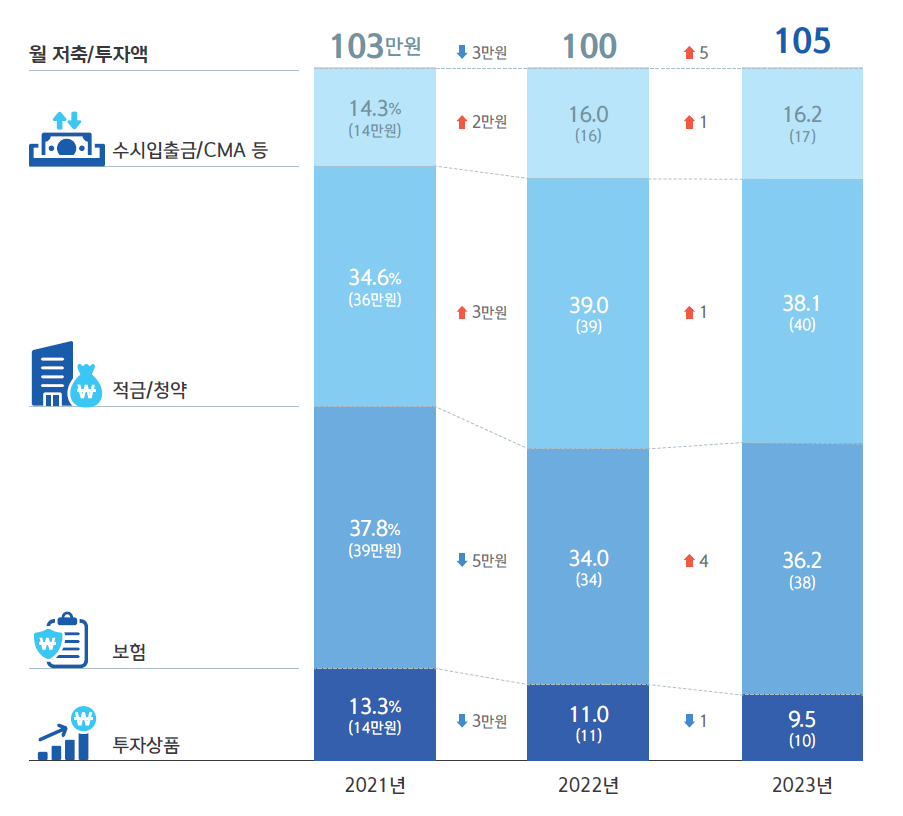 저축/투자액은 소폭 증가했다. 소득 내 비중을 20%대로 유지하면서 불황에 대비한 예비자금 확보 노력을 계속하는 것으로 보인다. 주식, 펀드 등 공격적인 투자는 줄이고 저축을 늘리며 자산을 안정적으로 운용하려는 패턴은 계속됐다.