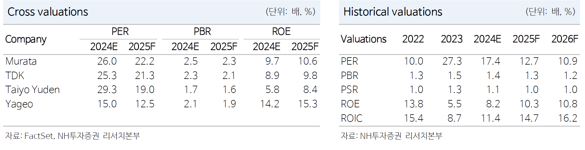 - 대표적인 동종업체들인 Murata와 Taiyo Yuden 대비 2025년 순이익 기준 동사 PER은 약 37% 저평가