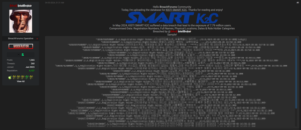 - 지난 4월30일 국제 해킹 단체 '인텔브로커(InterBroker)'는 KISTI가 운영하는 빅데이터 기반 분석 시스템 스마트 K2C를 해킹하는 데 성공했으며, 이를 통해 확보한 개인정보를 판매한다고 밝힘