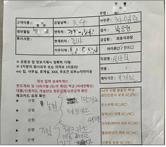 - 국정원이 확보한 자료에 따르면, 해당 보이스피싱 조직은 일반 기업체 사업 운영방식에 버금갈 정도로 체계적인 범행을 저질렀다. 상담을 맡은 조직원은 자체 제작한 피싱용 양식에 따라 피해자 △신원 사항 △재직기간·연봉 등 직장정보 △대출 여부·신용카드 개설연도 등 금융정보 △휴대전화 기종 등을 기재하고, 피싱 실적은 보수 지급 시 성과로 반영됐다