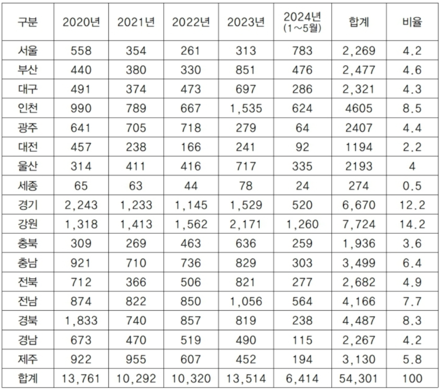 서울은 2020년 558건, 2021년 354건, 2022년 261건으로 서서히 줄다가, 2023년 313건으로 소폭 증가했다. 올해는 5개월 동안 지난해 전체의 250%가 넘는 급격한 증가세를 보였다.