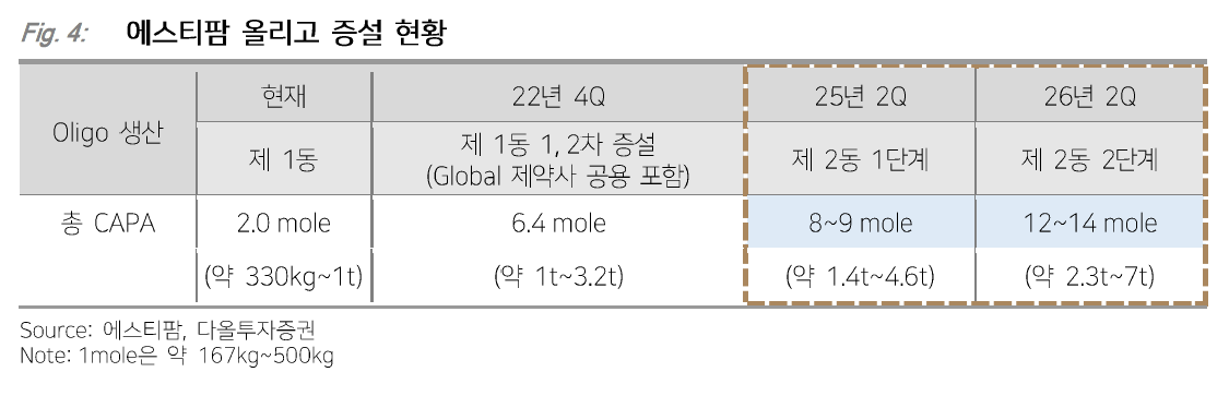 - 올리고핵산 치료제 분야에서 글로벌 3위의 생산능력을 보유하고 있으며, 2026년까지 생산능력을 두 배로 확대 시, 글로벌 1위로 도약할 가능성