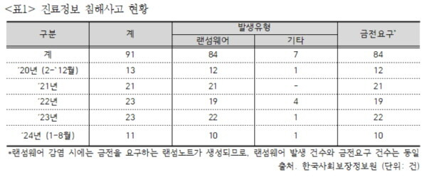 더불어민주당 전진숙 의원이 보건복지부, 한국사회보장정보원, 교육부, 한국인터넷진흥원으로부터 제출받은 자료에 따르면, 2020년 이후 총 91건 진료정보 침해사고 발생