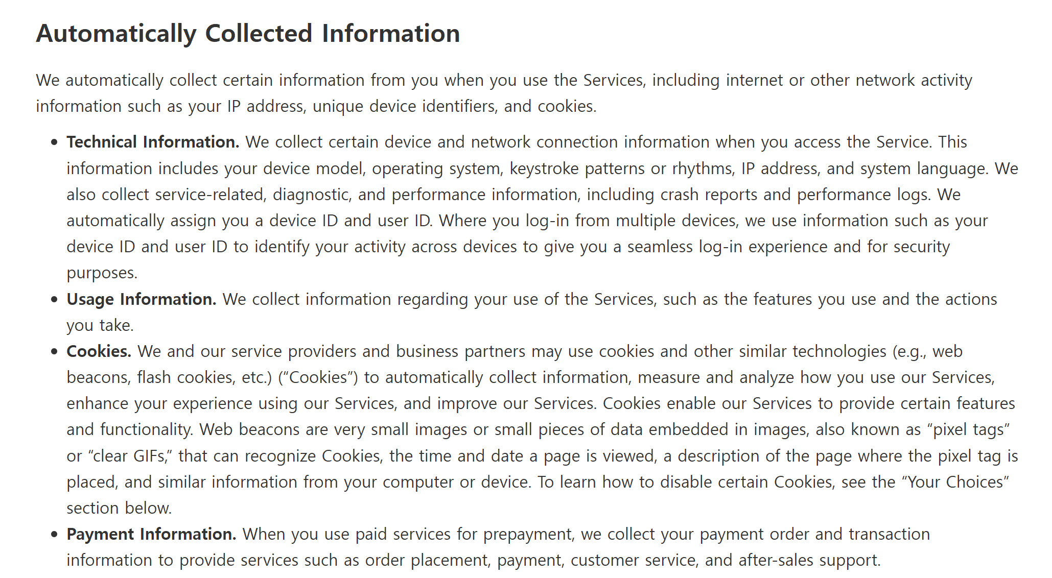 2. 서비 정보, 사용자 액션, 쿠키, 로그인 정보, 다른 웹 또는 앱에서의 활동정보 (구매 등)